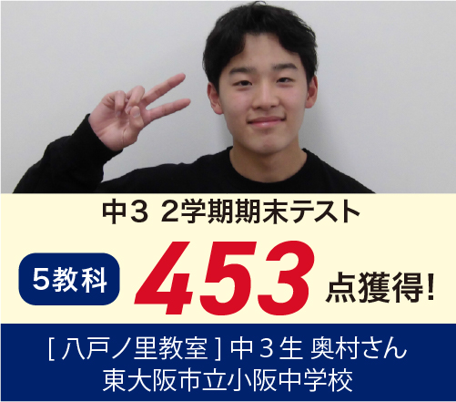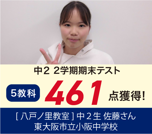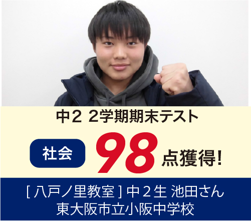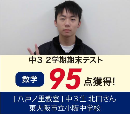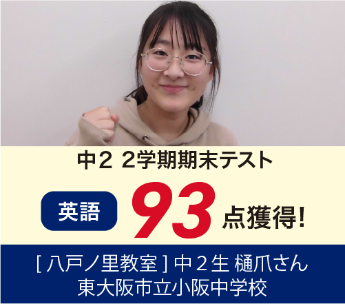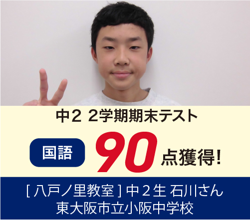 わからないところがわかるようになると、当たり前ですが成績は上がります。少しずつでも成果が出てくると、勉強も前向きに取り組むことができます。八戸ノ里教室は、そういうふうに頑張っていける環境がしっかりと整っている教室です。これから勉強を頑張ってみようという生徒さんはもちろん、今までいろいろとやってみたものの、どうもうまく学力が上がらずに悩んでいる生徒さんも、ぜひ一度八戸ノ里教室に足を運んでみてください。