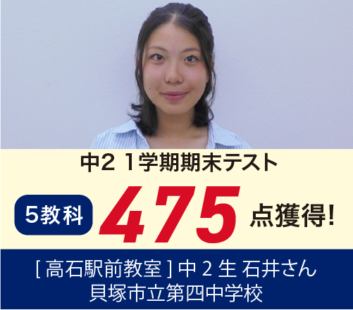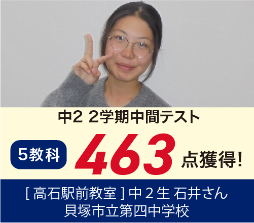 今回もよくがんばりました!一例を紹介いたします。中1生 5科400点以上を達成!(取石中)